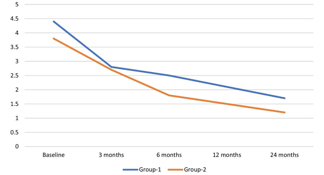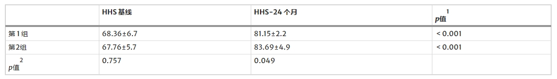 當(dāng)評(píng)估第1組和第2組的VAS評(píng)分時(shí),得出結(jié)論:基線和第3個(gè)月的VAS評(píng)分相似;6、12、24個(gè)月時(shí)差異有統(tǒng)計(jì)學(xué)意義,第2組VAS評(píng)分明顯較低。比較各組患者的HHS時(shí)得出的結(jié)論是,基線評(píng)分相似,第2組在第 24 個(gè)月時(shí)有顯著改善。