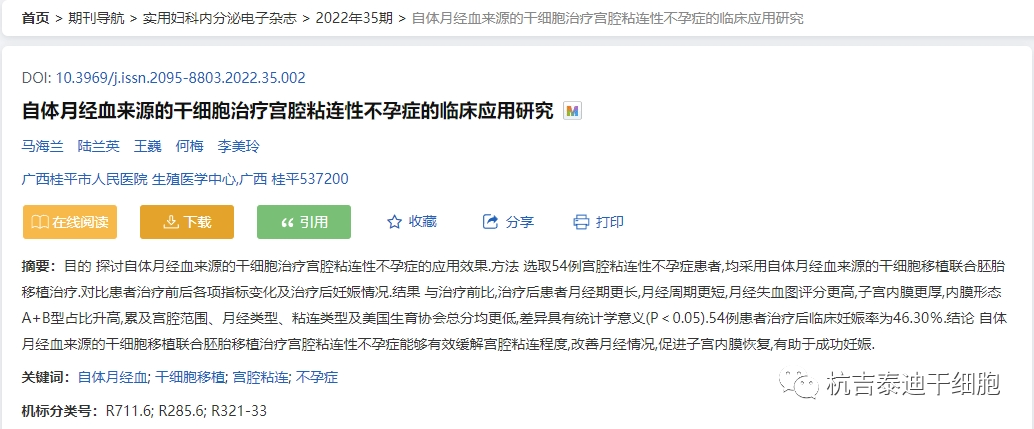 近期,廣西桂平市人民醫(yī)院發(fā)表了一項(xiàng)《自體月經(jīng)血來(lái)源的干細(xì)胞治療宮腔粘連性不孕癥的臨床應(yīng)用研究》,該發(fā)表在實(shí)用婦科內(nèi)分泌電子雜志上。
