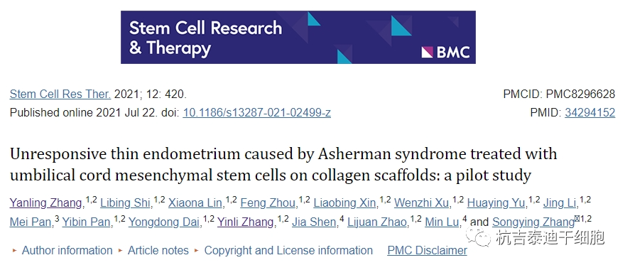 2021,浙江大學(xué)醫(yī)學(xué)院附屬邵逸夫醫(yī)院婦產(chǎn)科輔助生殖科張等人提供的研究中,選擇了17名患有Asherman綜合征的女性,作者嘗試通過(guò)膠原支架/臍帶間充質(zhì)干細(xì)胞(CS/UC-MSC)移植來(lái)再生子宮內(nèi)膜組織并提高懷孕機(jī)會(huì),看看這種療法是否可以幫助那些傳統(tǒng)方法沒(méi)有效果的人。(該論文發(fā)表在干細(xì)胞研究與治療雜志上)