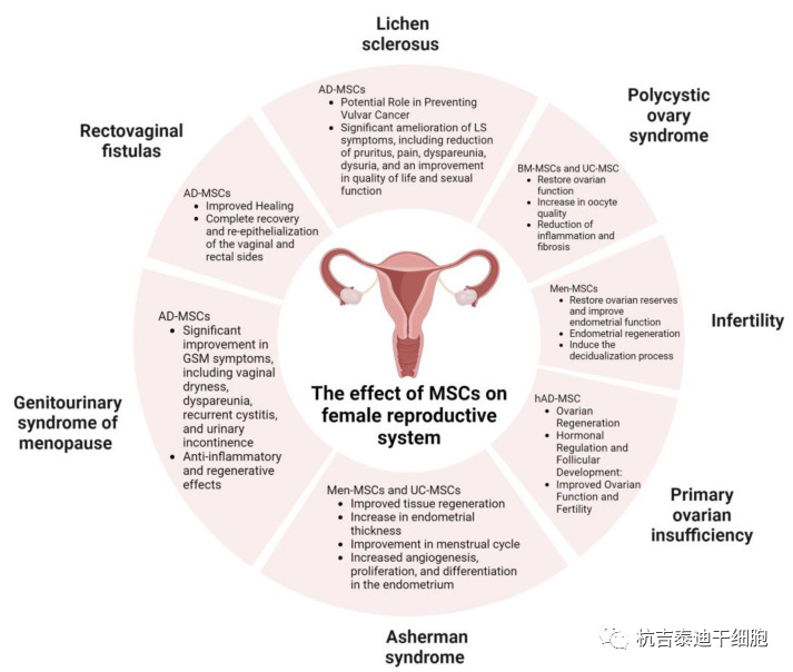 干細(xì)胞在醫(yī)學(xué)領(lǐng)域的潛力是極其積極的(下圖)。通過(guò)再生、分化、免疫調(diào)節(jié)、血管生成、抗氧化、抗凋亡等機(jī)制,它們帶來(lái)了新的治療模式并成功治療了許多疑難疾病。特別是在婦科領(lǐng)域,這些病癥的例子包括不孕癥、多囊卵巢綜合征、阿謝曼綜合征、GSM、直腸陰道瘺、硬化性苔蘚和卵巢早衰。