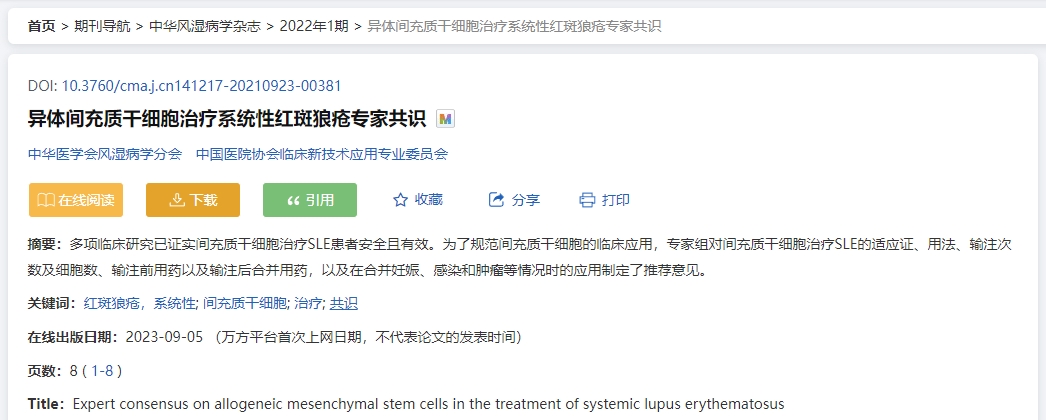 2022年,中華風(fēng)濕病學(xué)雜志發(fā)表了《異體間充質(zhì)干細(xì)胞治療系統(tǒng)性紅斑狼瘡專家共識》,文章概述了多項臨床研究已證實間充質(zhì)干細(xì)胞治療SLE患者安全且有效。為了規(guī)范間充質(zhì)干細(xì)胞的臨床應(yīng)用,專家組對間充質(zhì)干細(xì)胞治療SLE的適應(yīng)證、用法、輸注次數(shù)及細(xì)胞數(shù)、輸注前用藥以及輸注后合并用藥,以及在合并妊娠、感染和腫瘤等情況時的應(yīng)用制定了推薦意見。
