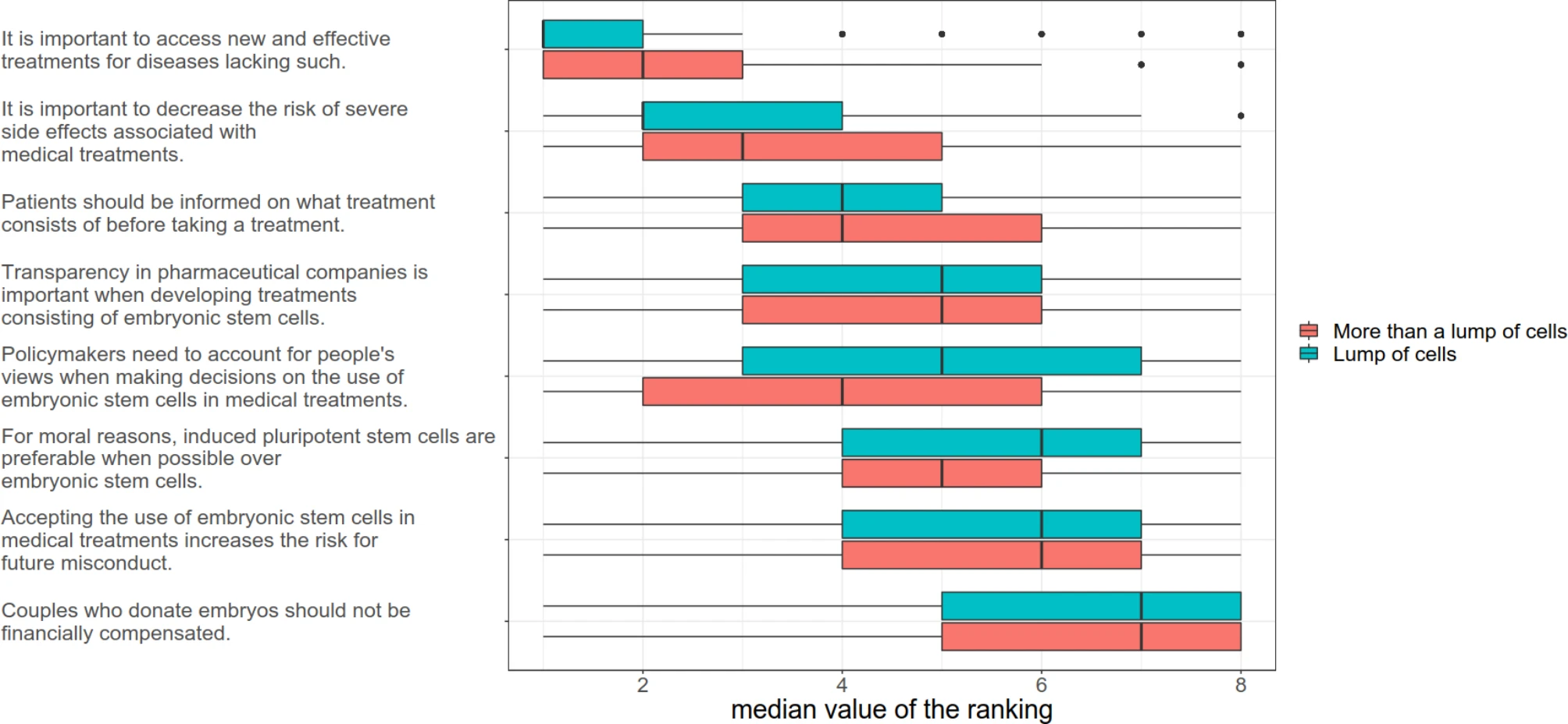 作為排名練習(xí)的一部分,PD患者對(duì)八個(gè)陳述進(jìn)行了排名(圖2)。結(jié)果以“不僅僅是一團(tuán)細(xì)胞”和“一團(tuán)細(xì)胞”亞組呈現(xiàn),以表明受訪(fǎng)者的排名并不取決于他們對(duì)胚胎的看法。排名最高的說(shuō)法是“針對(duì)缺乏此類(lèi)疾病的疾病獲得新的有效治療方法非常重要”;第二個(gè)是“降低與醫(yī)療相關(guān)的嚴(yán)重副作用的風(fēng)險(xiǎn)非常重要?!?/p>