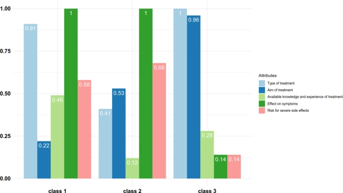 帕金森病患者被邀請(qǐng)完成一項(xiàng)基于網(wǎng)絡(luò)的離散選擇實(shí)驗(yàn),以評(píng)估以下屬性的重要性:(i) 治療類(lèi)型,(ii) 治療目的,(iii) 不同類(lèi)型治療的現(xiàn)有知識(shí),( iv) 對(duì)癥狀的影響,以及 (v) 嚴(yán)重副作用的風(fēng)險(xiǎn)。潛在類(lèi)別條件邏輯回歸模型用于確定偏好估計(jì)和受訪(fǎng)者偏好的異質(zhì)性。