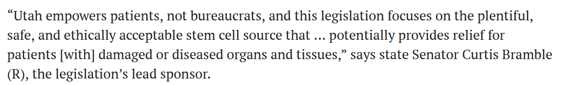 猶他州參議員Curtis Bramble (R)是這項法案的主要發(fā)起人,他表示:猶他州將權(quán)利下放到患者本人,而非政府工作人員,法案通過的是豐富的、安全的、倫理可接受來源的干細胞,能夠為組織器官受損的患者提供治療。