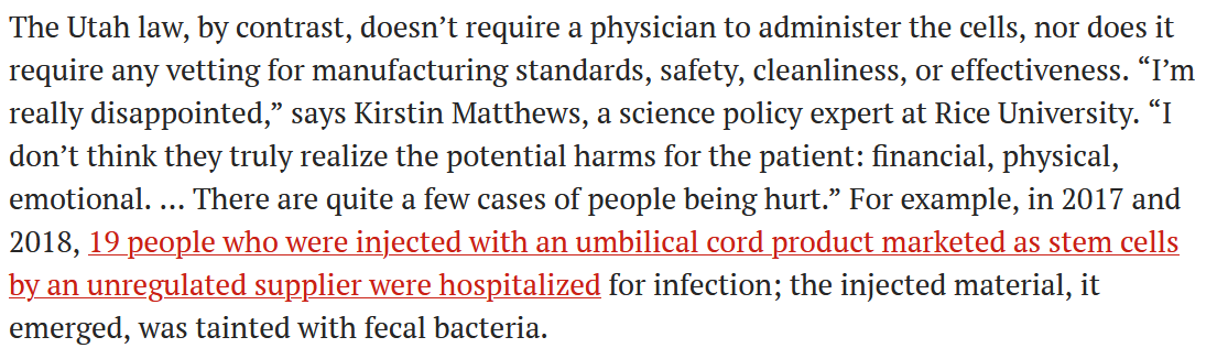 萊斯大學(xué)的科學(xué)政策專家Kirstin Matthews表示:與其他州相比,猶他州的法律不需要醫(yī)生來管理細胞,也不需要對細胞的制造標準、安全性、清潔度和有效性進行審查,政府工作人員并未認識到這對患者在經(jīng)濟上、身體上和情感上的傷害,在2017年和2018年就發(fā)生過19人因注射了市面上銷售的不受監(jiān)管的臍帶干細胞產(chǎn)品,感染住院,后被發(fā)現(xiàn),注射的材料被糞便細菌污染了。