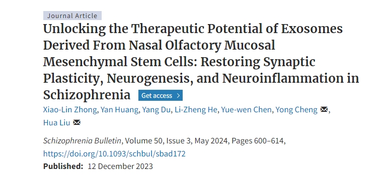 2024年5月,中央民族大學(xué)生命與環(huán)境科學(xué)學(xué)院轉(zhuǎn)化神經(jīng)科學(xué)研究中心聯(lián)合國家衛(wèi)生健康委出生缺陷研究與防治重點(diǎn)實(shí)驗(yàn)室在國際期刊《Schizophrenia Bulletin》上發(fā)表了一篇關(guān)于Unlocking the Therapeutic Potential of Exosomes Derived From Nasal Olfactory Mucosal Mesenchymal Stem Cells: Restoring Synaptic Plasticity, Neurogenesis, and Neuroinflammation in Schizophrenia(釋放鼻嗅黏膜間充質(zhì)干細(xì)胞外泌體的治療潛力:恢復(fù)精神分裂癥患者的突觸可塑性、神經(jīng)發(fā)生和神經(jīng)炎癥)的文章。