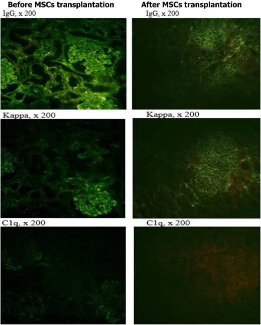 接受間充質(zhì)干細(xì)胞移植后,腎臟活檢的免疫熒光顯示腎小球血管環(huán)中的免疫炎癥過程減少:IgG、kappa 和 C1q 染色強(qiáng)度降低。