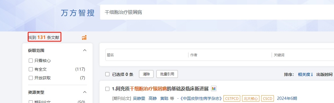 截止2024年10月29日,國內(nèi)萬方數(shù)據(jù)wanfangdata網(wǎng)站上搜索關(guān)于干細(xì)胞治療銀屑病的相關(guān)文章研究成果有131條。