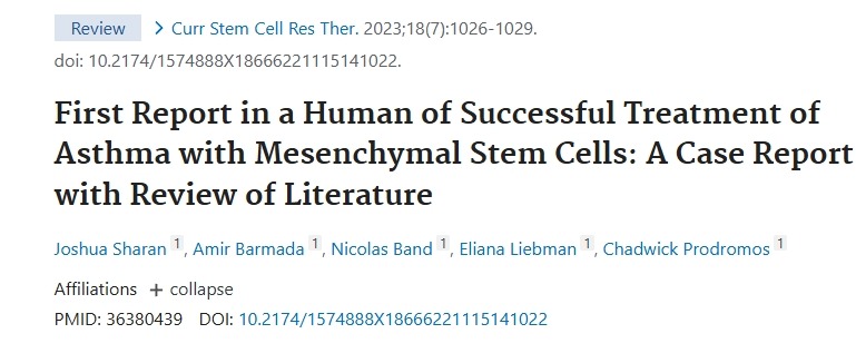 【6】Sharan J, Barmada A, Band N, Liebman E, Prodromos C. First Report in a Human of Successful Treatment of Asthma with Mesenchymal Stem Cells: A Case Report with Review of Literature. Curr Stem Cell Res Ther. 2023;18(7):1026-1029. doi: 10.2174/1574888X18666221115141022. PMID: 36380439.