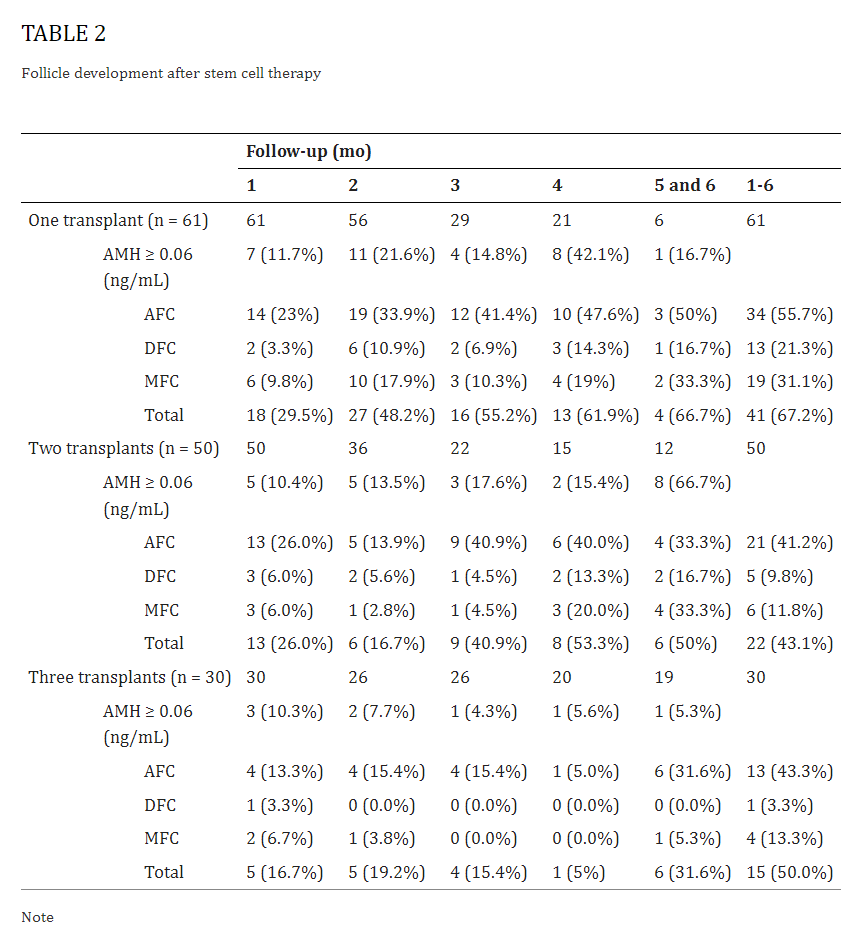通過超聲引導(dǎo)下經(jīng)陰道注射將臍帶間充質(zhì)干細胞移植給患者,結(jié)果定義為干細胞治療后每月成熟卵母細胞的數(shù)量(表2)。所有患者均接受了第一輪手術(shù);但部分患者未能接受第二輪和第三輪移植,導(dǎo)致數(shù)例失訪。術(shù)后每月收集AMH、竇卵泡(AFC)、優(yōu)勢卵泡數(shù)(DFC)和成熟卵泡數(shù)(MFC)的數(shù)據(jù)。特別是,我們只能在第一次移植五個月后獲得六名患者的結(jié)果;因此,我們將第5個月和第6個月的數(shù)據(jù)整合到一個項目中以更加直觀。