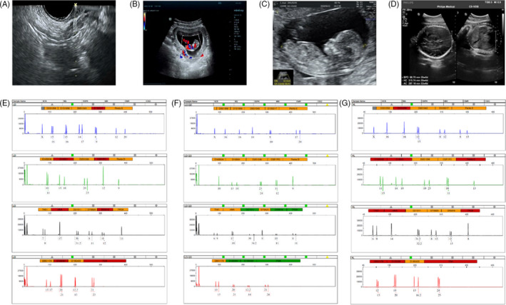 收集了15名接受取卵的患者的基本特征,包括取卵周期、胚胎移植和妊娠次數(shù)。一般來說,四個胎兒沒有出生缺陷,三個胚胎來自ICSI的受精類型,而最后一個是自然受孕的。1例術(shù)中超聲掃描顯示,在經(jīng)陰道超聲(TVUS)引導(dǎo)下,卵巢未見間質(zhì)增生或其他異常卵巢結(jié)構(gòu)(圖2A)。這名婦女在體外受精后成功懷孕,并在第8周進行了基本產(chǎn)前程序的超聲掃描(圖2B),第13周(圖2C) 和第32周 (圖二維) 顯示正常的胎兒發(fā)育。微衛(wèi)星位點分析顯示,胎兒(圖2F)與母親有遺傳關(guān)系(圖2E) 供體UCMSC以外的其他人(圖2G)。