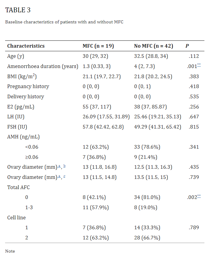 為了確認治療效果與治療之前之間的關(guān)系,我們比較了19名在UCMSC注射后獲得成熟卵泡的患者和其他 42名未發(fā)育成熟卵泡的患者的基本臨床特征。MFC患者的中位年齡為30歲,閉經(jīng)持續(xù)時間為1.3年。這些MFC患者的E2血激素水平有高于無MFC組的趨勢,兩組之間LH和FSH水平?jīng)]有差異。作為卵巢儲備的有效指標,還測試了AMH水平。總體而言,MFC組36.8%的AMH水平≥0.06ng/mL,而無MFC組的比例為 21.4%。