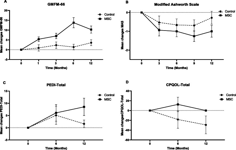 每組有36名參與者。與基線(xiàn)和對(duì)照組相比,臍帶間充質(zhì)干細(xì)胞移植組干預(yù)12個(gè)月后的平均GMFM-66評(píng)分顯著更高。PEDI總分也有所增加。