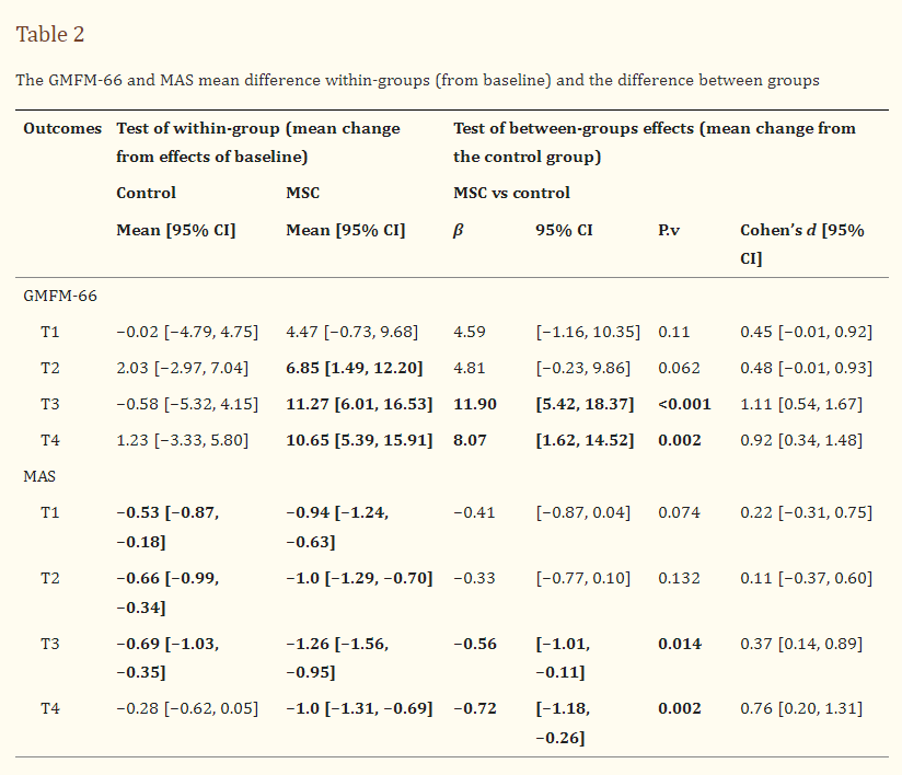 其他量表的評(píng)估顯示,從基線(xiàn)到細(xì)胞注射后12個(gè)月的平均MAS評(píng)分顯著下降((圖4B),并且臍帶間充質(zhì)干細(xì)胞移植組的平均變化在統(tǒng)計(jì)學(xué)上高于具有較大效應(yīng)量的對(duì)照組(表2)。