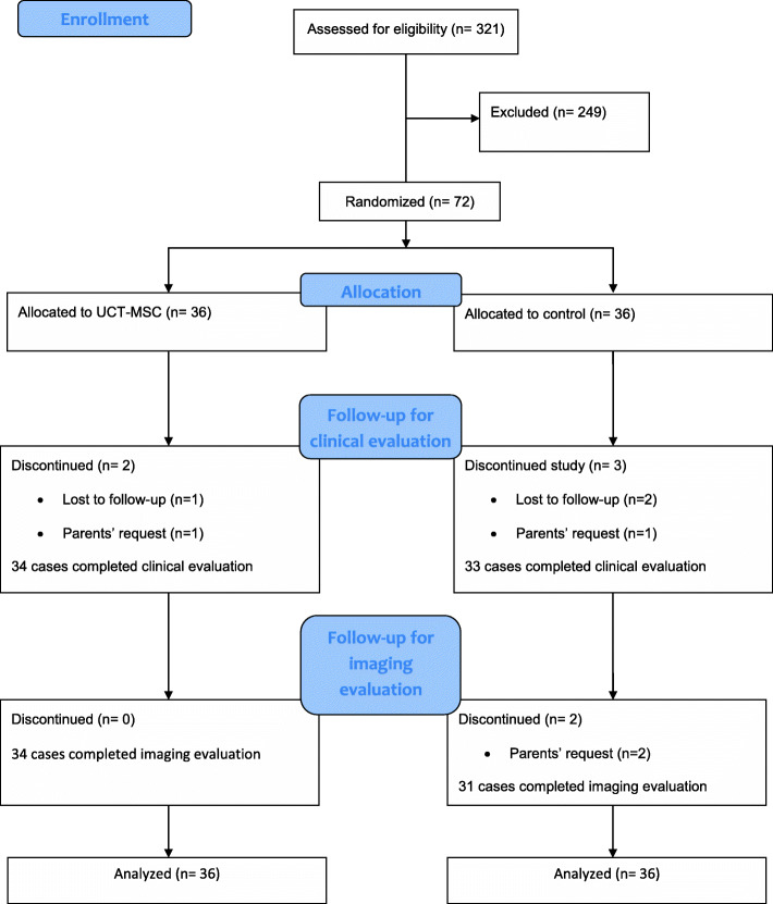 患有痙攣性CP的參與者(4-14歲)按1:1的比例分配接受UCT-MSC或假手術(shù)。實(shí)驗(yàn)組給予單劑量(2×107)細(xì)胞。在假對(duì)照臂中對(duì)下背部進(jìn)行小針刺。所有人都被鎮(zhèn)靜以防止意識(shí)。