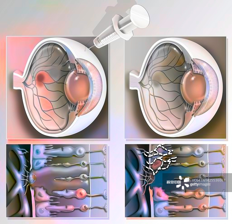 輸送細(xì)胞的另一種方式是將細(xì)胞懸浮液注射到視網(wǎng)膜下的眼睛中。來自 iPS 細(xì)胞、人類胚胎干細(xì)胞或 RPE 干細(xì)胞的細(xì)胞在實驗室中生長并分化為 RPE,然后置于液體中并注射。這種方法可能侵入性較小。