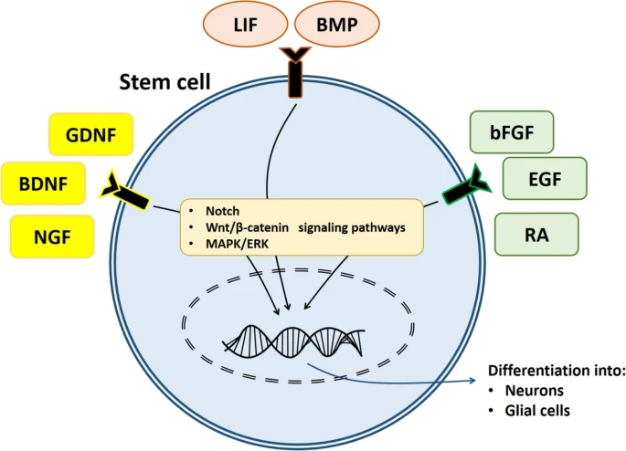 干細(xì)胞的命運(yùn)取決于鄰近細(xì)胞分泌的因子。腦源性神經(jīng)營養(yǎng)因子 (BDNF)、神經(jīng)生長因子 (NGF) 和膠質(zhì)細(xì)胞源性神經(jīng)營養(yǎng)因子 (GDNF) 引導(dǎo)干細(xì)胞向神經(jīng)元分化。堿性成纖維細(xì)胞生長因子 (bFGF)、表皮生長因子 (EGF) 和視黃酸 (RA) 已被證實(shí)能夠刺激干細(xì)胞向神經(jīng)元分化,而白血病抑制因子 (LIF) 和骨形態(tài)發(fā)生蛋白 (BMP) 則促進(jìn)膠質(zhì)細(xì)胞分化。