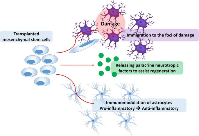 干細(xì)胞不僅能夠分化成功能性神經(jīng)元并取代受損的神經(jīng)元,還能發(fā)揮其他保護(hù)作用。干細(xì)胞的這些有益特性包括:
