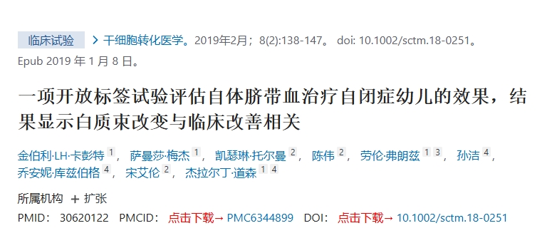 2019年,Carpenter等人進(jìn)行了”一項(xiàng)開放標(biāo)簽試驗(yàn)評估自體臍帶血治療自閉癥幼兒的效果,結(jié)果顯示白質(zhì)束改變與臨床改善相關(guān)“的研究,通過輸注自體臍帶血單核細(xì)胞進(jìn)行了擴(kuò)散張量纖維束成像檢查。雖然成像數(shù)據(jù)觀察到輕微改善,但研究人員報(bào)告稱社交和溝通技巧也有輕微提高。