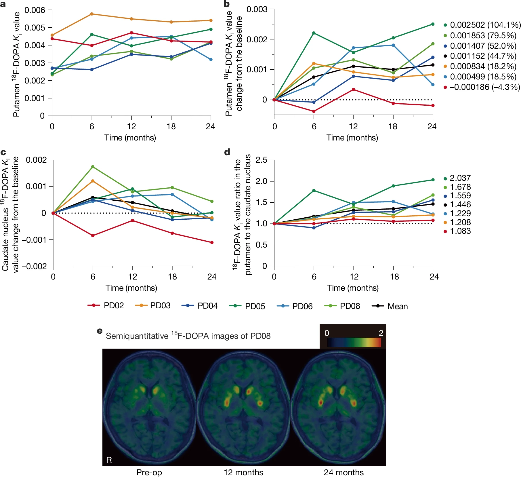 24個月時,殼核區(qū)域 18F-DOPA K?值總平均增加44.7%(從0.0032升至0.0043),其中高劑量組增幅達63.5%,低劑量組增加7.0%;8個高劑量移植殼核中7個出現(xiàn) K?值升高,顯著高于低劑量組(4個中2個)。尾狀核 K?值則呈下降趨勢(圖