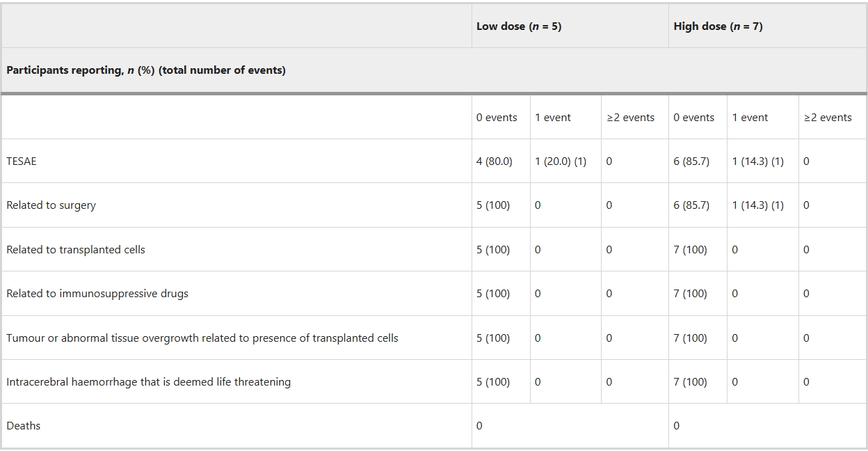 • 主要目標:評估 bemdaneprocel 細胞移植后1年的安全性和耐受性,基于不良事件發(fā)生率進行分析。
