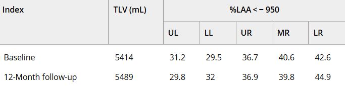 • 肺氣腫程度:通過低衰減區(qū)(LAA)百分比評(píng)估肺泡破壞改善情況。