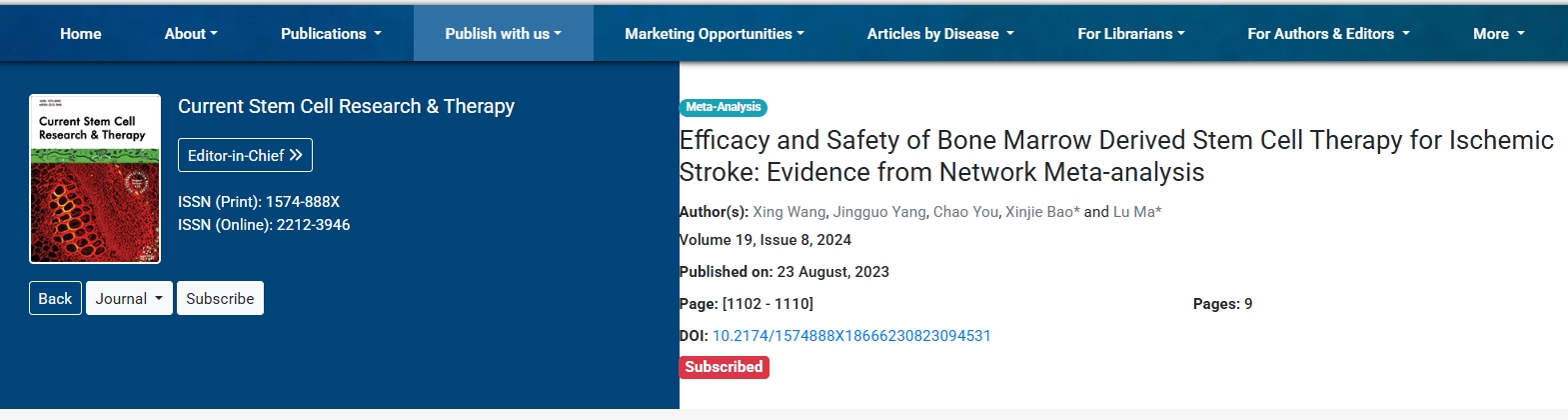 由于目前,有數(shù)種類型的干細胞可用于治療中風患者。然而,最佳干細胞類型仍不清楚。為此,四川大學華西醫(yī)院神經(jīng)外科聯(lián)合北京協(xié)和醫(yī)院神經(jīng)外科開了一項評估骨髓干細胞治療缺血性卒中的療效和安全性的臨床試驗。該項臨床試驗發(fā)表在期刊雜志《Current Stem Cell Research&Therapy》上。