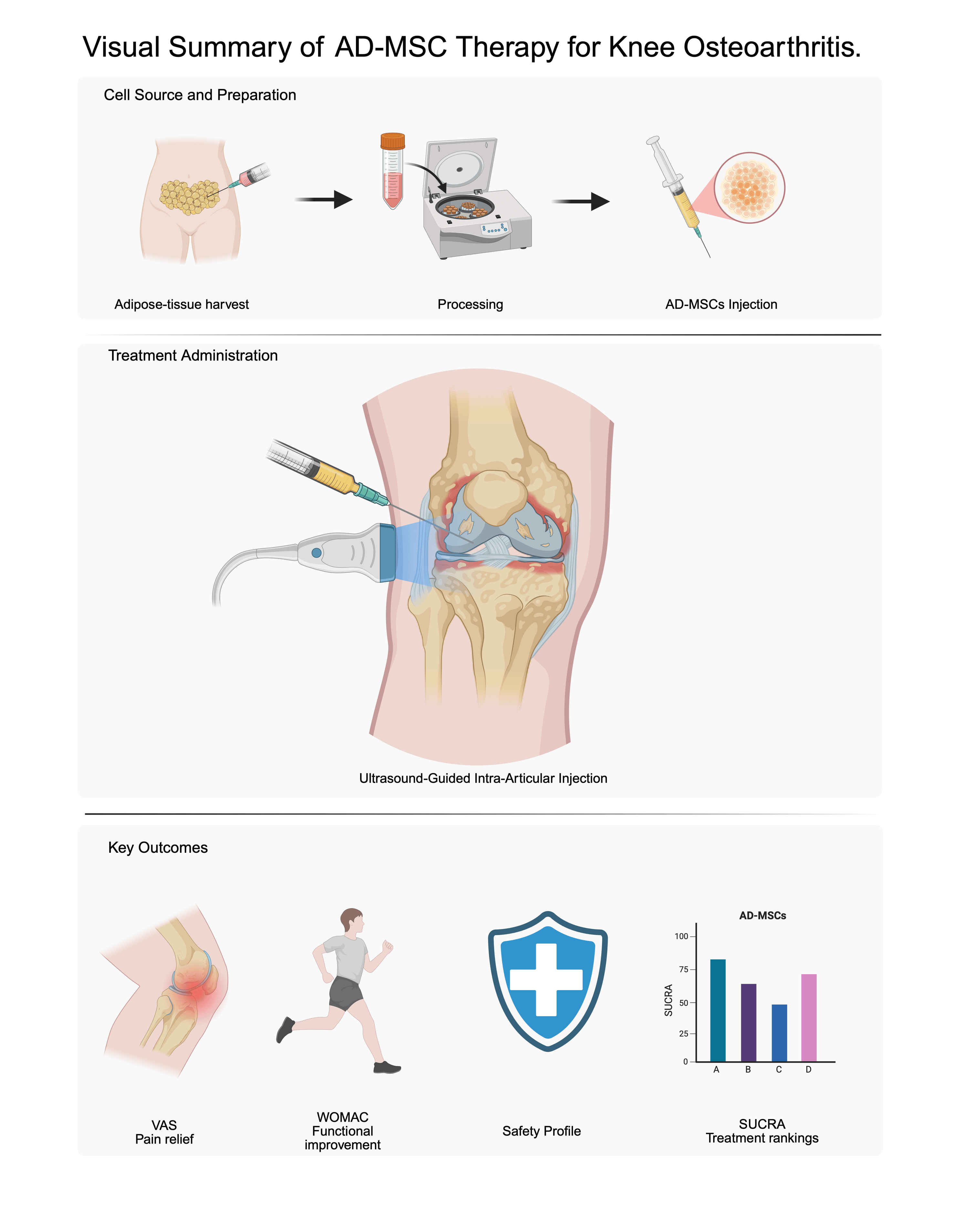 這項(xiàng)網(wǎng)絡(luò)薈萃分析表明,與傳統(tǒng)的膝關(guān)節(jié)骨關(guān)節(jié)炎關(guān)節(jié)內(nèi)注射治療相比,高劑量AD-MSC療法在緩解疼痛和改善功能方面效果更佳。研究觀察到明顯的劑量依賴性反應(yīng),高劑量在癥狀緩解和功能恢復(fù)方面始終優(yōu)于低劑量。高劑量自體AD-MSC在快速和持續(xù)緩解疼痛方面效果最佳,而高劑量異基因AD-MSC在6個(gè)月和12個(gè)月的長(zhǎng)期功能恢復(fù)方面效果最佳,表明兩種療法的療效特征各異。雖然高劑量組患者出現(xiàn)短暫性關(guān)節(jié)疼痛和腫脹等輕度至中度不良反應(yīng)的幾率更高,但嚴(yán)重不良事件罕見,且發(fā)生率與對(duì)照組相似,這支持了AD-MSC療法的總體安全性。
