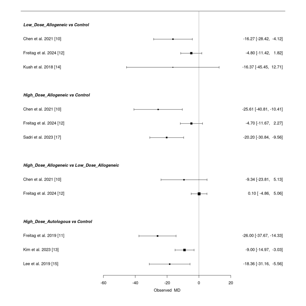 低劑量異基因AD-MSCs在Chen等(2021年)和Freitag 等(2024年)研究中僅表現(xiàn)出小幅改善(MD 分別為 – 6.46 和 – 3.24),Kuah 等(2018 年)因置信區(qū)間寬泛,療效不確定性突出。高劑量異基因 AD-MSCs 在 Sadri 等(2023 年)研究中實(shí)現(xiàn)強(qiáng)效改善,F(xiàn)reitag 等(2024 年)也觀察到顯著但較溫和的效果(MD=-5.81),但 Chen 等(2021 年)因置信區(qū)間較寬,效果存疑。高劑量自體 AD-MSCs 在 Freitag(2019 年,MD=-17.00)和 Lee(2019 年,MD=-17.13)等研究中均顯示顯著改善,即使 Kim 等(2023 年)的中等效果(MD=-5.60)仍優(yōu)于低劑量組。高劑量與低劑量異基因組的直接比較因置信區(qū)間重疊,未顯示明確劑量?jī)?yōu)勢(shì)。