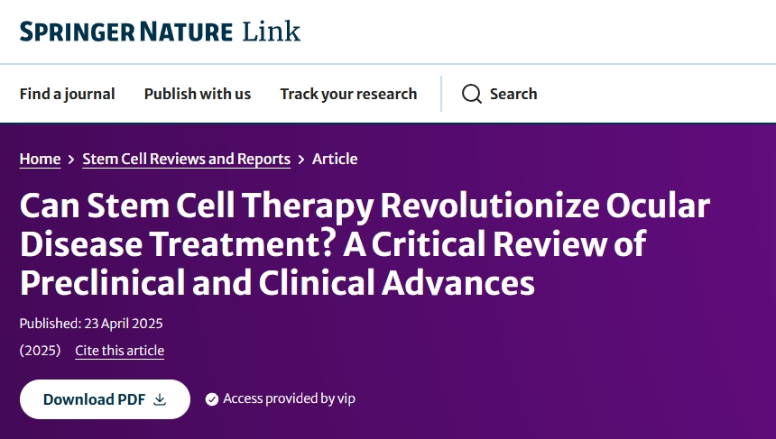 近日,著名期刊雜志“Stem Cell Reviews and Reports”(干細胞評論和報告)發(fā)表了一篇“Can Stem Cell Therapy Revolutionize Ocular Disease Treatment? A Critical Review of Preclinical and Clinical Advances”(干細胞療法能否徹底改變眼部疾病治療?臨床前及臨床進展綜述)的文章。