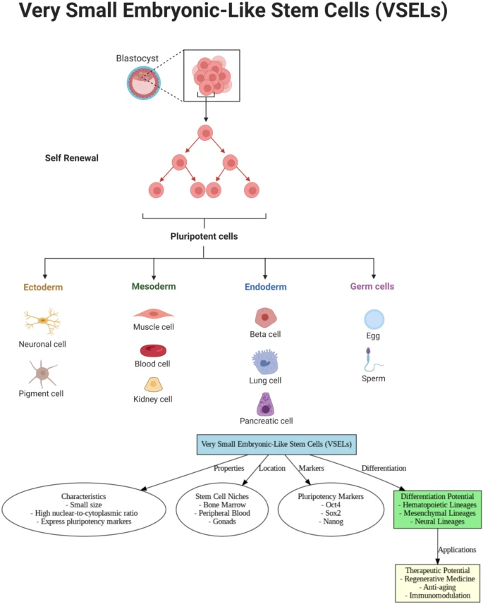 圖5:極小胚胎樣干細(xì)胞 (VSEL) 是具有分化成造血、間充質(zhì)和神經(jīng)譜系的潛能的多能細(xì)胞。它們存在于干細(xì)胞微環(huán)境,表達(dá)多能性標(biāo)志物,在再生醫(yī)學(xué)、抗衰老和免疫調(diào)節(jié)方面具有治療潛力。
