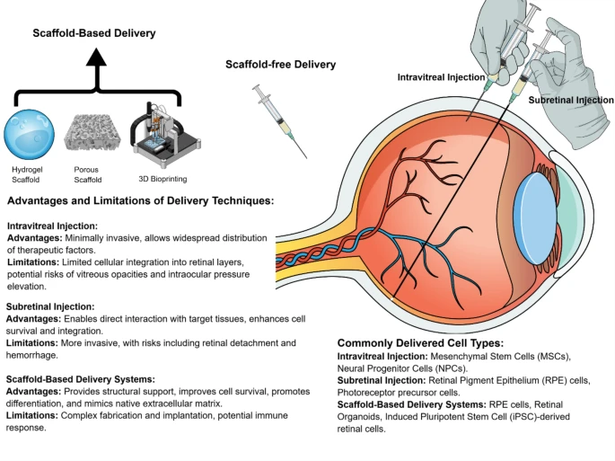 基于支架的遞送系統(tǒng):基于支架的遞送系統(tǒng)涉及使用生物相容性材料(例如水凝膠或聚合物支架)在移植過程中支撐干細(xì)胞。這些系統(tǒng)通過模擬天然細(xì)胞外基質(zhì)來提高細(xì)胞存活率、促進(jìn)分化并促進(jìn)整合。例如,已開發(fā)出用于治療AMD視網(wǎng)膜下植入的載有RPE細(xì)胞的支架。此外,3D生物打印技術(shù)正在使創(chuàng)建能夠復(fù)制眼部組織結(jié)構(gòu)的定制支架成為可能?;谥Ъ艿姆椒ù砹丝朔?xì)胞存活和定位相關(guān)挑戰(zhàn)的一種有希望的途徑。