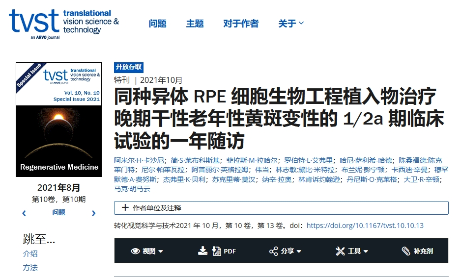 同種異體RPE細(xì)胞生物工程植入物治療晚期干性老年性黃斑變性的1/2a期臨床試驗(yàn)的一年隨訪