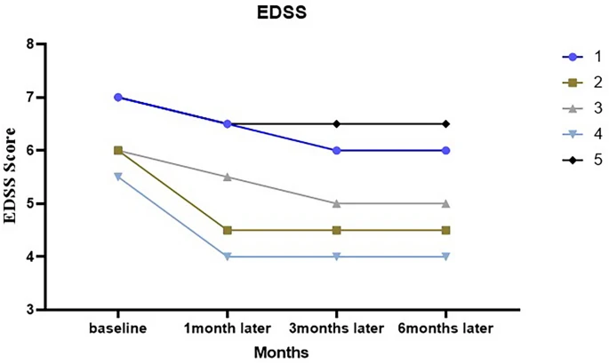 EDSS在細胞注射后第一個月下降,兩名患者在第三個月呈下降趨勢,其余患者則保持不變(圖2)。表S1描述了注射前三年和注射MSCs后一年的EDSS變化。