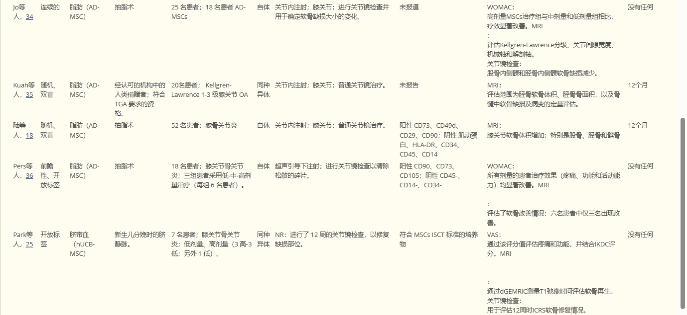 總體而言,大多數(shù)研究通過MRI和核心量表(VAS, WOMAC)證實了MSCs治療在改善OA結(jié)構(gòu)(軟骨)和癥狀(疼痛、功能)方面的積極作用,但效果存在劑量依賴性和個體差異。