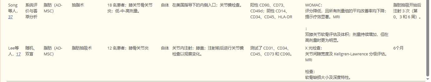 本部分納入的研究主要使用自體來源的間充質(zhì)干細胞(MSCs),包括骨髓(BM-MSC)、脂肪(AD-MSC) 和臍帶血(UCB-MSC) 三種來源,其中脂肪來源最常見(六項研究),臍帶血來源最少(一項研究);提取方法依來源而異(如脂肪組織用吸脂術(shù),骨髓用穿刺抽吸法)。干細胞主要通過關(guān)節(jié)內(nèi)注射給予患者。