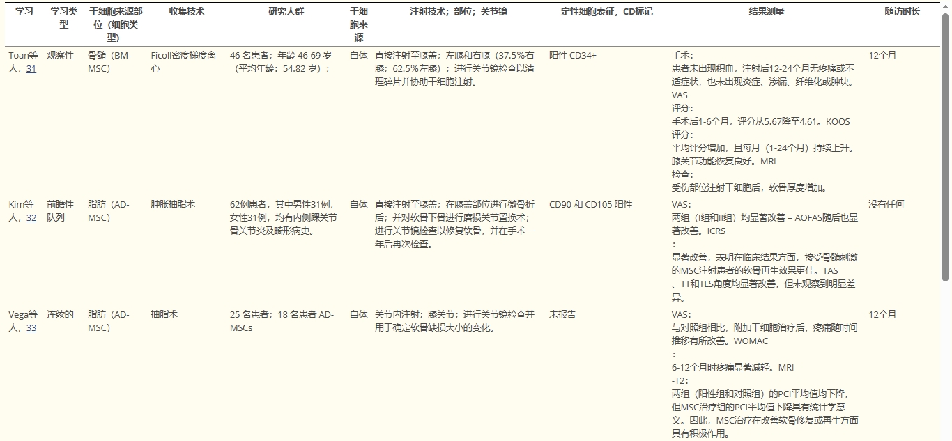 所有納入研究均聚焦于膝骨關(guān)節(jié)炎(OA)患者,他們接受了主要通過關(guān)節(jié)內(nèi)注射的間充質(zhì)干細胞(MSCs) 治療(部分研究聯(lián)合關(guān)節(jié)鏡),旨在改善膝關(guān)節(jié)損傷狀況;