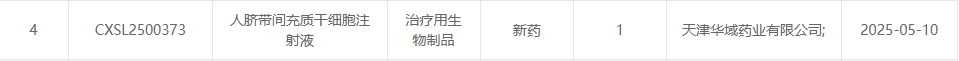 新增受理11:2025年05月10號,天津華域藥業(yè)有限公司的人臍帶間充質(zhì)干細胞注射液的臨床試驗申請獲受理(受理號:CXSL2500373)。這是該款細胞注射液1獲得受理。