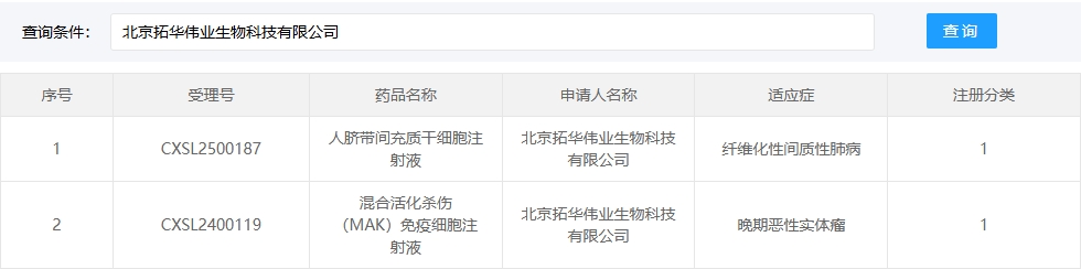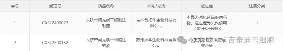 新增受理7:2025年02月28號,北京拓華偉業(yè)生物科技有限公司的人臍帶間充質(zhì)干細胞注射液的臨床試驗申請獲受理(受理號:CXSL2500187)。適應癥:纖維化性間質(zhì)性肺病。