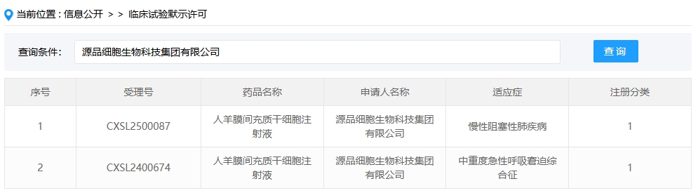 新增受理3:2025年1月27號,源品細胞生物科技集團有限公司的人羊膜間充質(zhì)干細胞注射液的臨床試驗申請獲受理(受理號:CXSL2500087)。這是該款細胞注射液第2次獲得受理,適應癥:慢性阻塞性肺疾病。