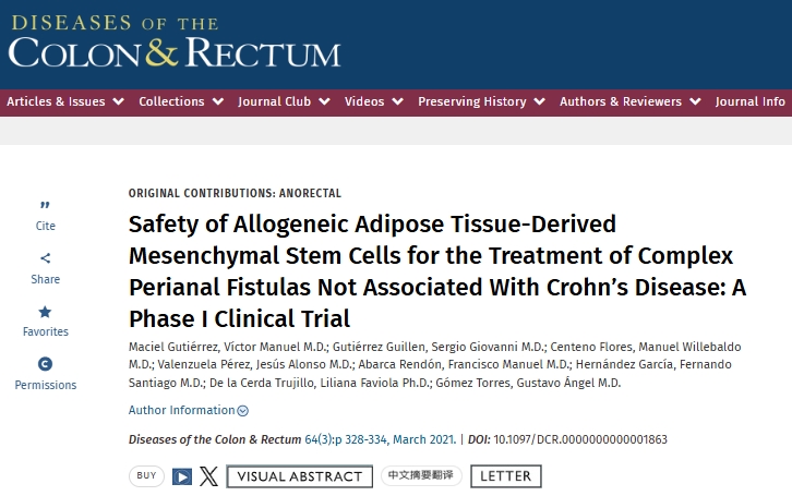 2021年,Maciel等人進(jìn)行了一項(xiàng)“同種異體脂肪組織來源的間充質(zhì)干細(xì)胞治療與克羅恩病無關(guān)的復(fù)雜性肛周瘺的安全性:I期臨床試驗(yàn)的研究”,旨在評估同種異體間充質(zhì)干細(xì)胞 (MSC) 治療非克羅恩病患者的復(fù)雜性肛瘺的安全性。