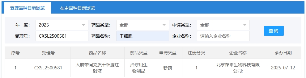 新增受理10:2025年07月28號(hào),北京第一生物科技開發(fā)有限公司申報(bào)的“人臍帶間充質(zhì)干細(xì)胞注射液”的臨床試驗(yàn)獲受理(受理號(hào):CXSL2500627),這是該款細(xì)胞注射液第1次獲得受理。