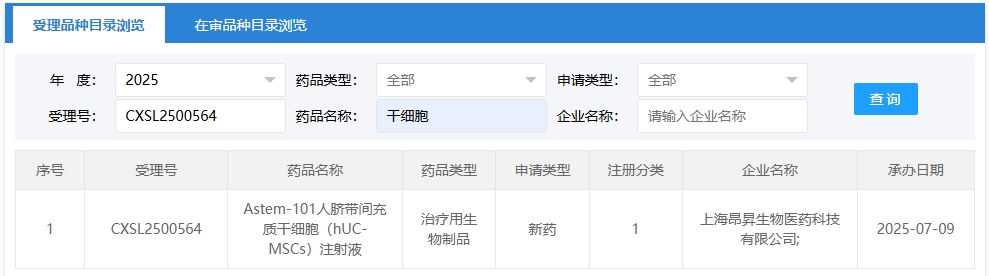 新增受理8:2025年07月09號(hào),上海昂昇生物醫(yī)藥科技有限公司申報(bào)的“Astem-101人臍帶間充質(zhì)干細(xì)胞(hUC-MSCs)注射液”的臨床試驗(yàn)申請(qǐng)獲受理(受理號(hào):CXSL2500564),這是該款細(xì)胞注射液第1次獲得受理。