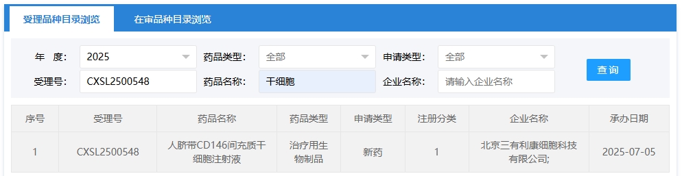 新增受理6:2025年07月05號(hào),北京三有利康細(xì)胞科技有限公司申報(bào)的“人臍帶CD146間充質(zhì)干細(xì)胞注射液”的臨床試驗(yàn)申請(qǐng)獲受理(受理號(hào):CXSL2500548),這是該款細(xì)胞注射液第1次獲得受理。