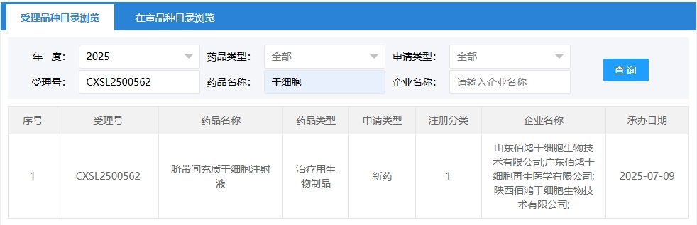 新增受理7:2025年07月09號(hào),山東佰鴻干細(xì)胞生物技術(shù)有限公司聯(lián)合廣東佰鴻干細(xì)胞再生醫(yī)學(xué)有限公司,陜西佰鴻干細(xì)胞生物技術(shù)有限公司申報(bào)的“臍帶間充質(zhì)干細(xì)胞注射液”的臨床試驗(yàn)申請(qǐng)獲受理(受理號(hào):CXSL2500562),這是該款細(xì)胞注射液第1次獲得受理。