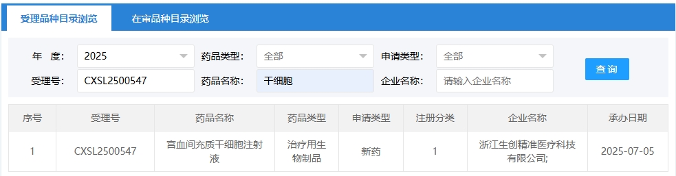 新增受理5:2025-07-05,浙江生創(chuàng)精準(zhǔn)醫(yī)療科技有限公司申報(bào)的“宮血間充質(zhì)干細(xì)胞注射液”的臨床試驗(yàn)申請(qǐng)獲受理(受理號(hào):CXSL2500547),這是該細(xì)胞注射液第4次獲得受理。