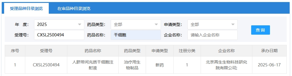 新增受理3:2025年06月17號(hào),北京再生生物科技研究院有限公司申報(bào)的“人臍帶間充質(zhì)干細(xì)胞注射液”的臨床試驗(yàn)申請(qǐng)獲受理(受理號(hào):CXSL2500494),這是該款細(xì)胞注射液第1次獲得受理。
