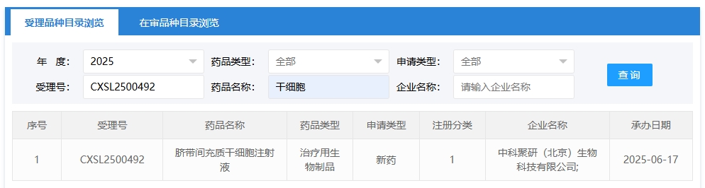 新增受理2:2025年06月17號(hào),中科聚研(北京)生物科技有限公司申報(bào)的“臍帶間充質(zhì)干細(xì)胞注射液”的臨床試驗(yàn)申請(qǐng)獲受理(受理號(hào):CXSL2500492),這是該款細(xì)胞注射液第1次獲得受理。