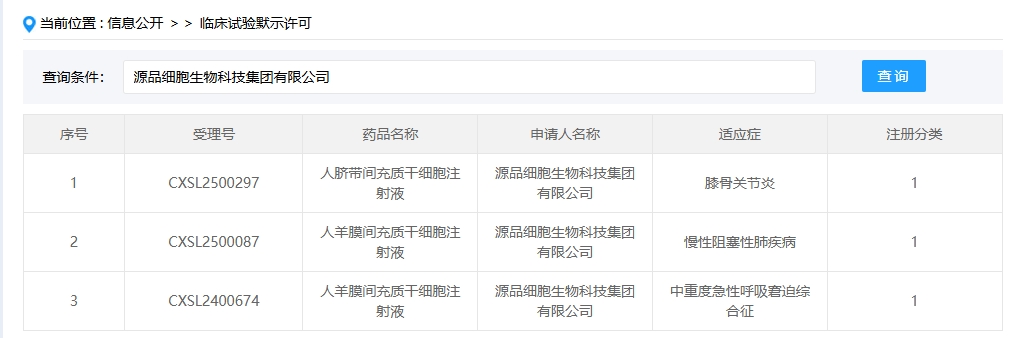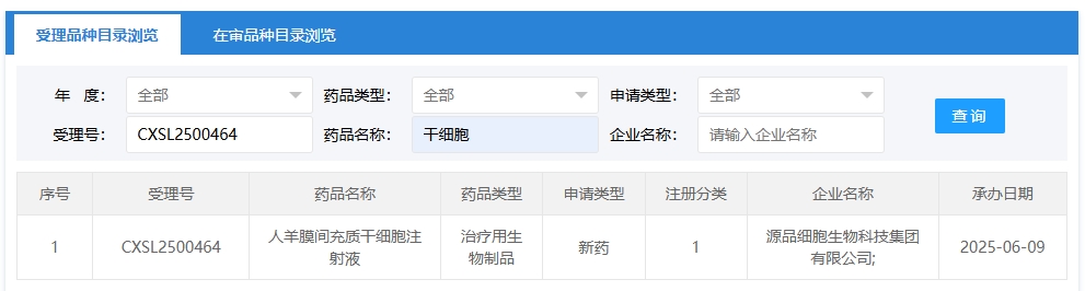 新增受理1:2025年6月9號(hào),源品細(xì)胞生物科技集團(tuán)有限公司申報(bào)的“人羊膜間充質(zhì)干細(xì)胞注射液”臨床試驗(yàn)申請(qǐng)獲受理(受理號(hào):CXSL2500464),這是該款細(xì)胞注射液第5次獲得受理。