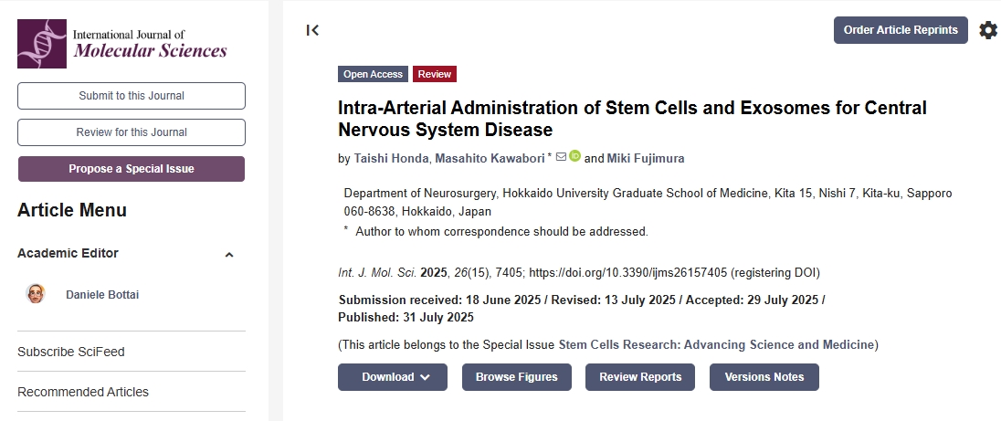 [1]:Honda, T.; Kawabori, M.; Fujimura, M. Intra-Arterial Administration of Stem Cells and Exosomes for Central Nervous System Disease. Int. J. Mol. Sci. 202526, 7405. https://doi.org/10.3390/ijms26157405